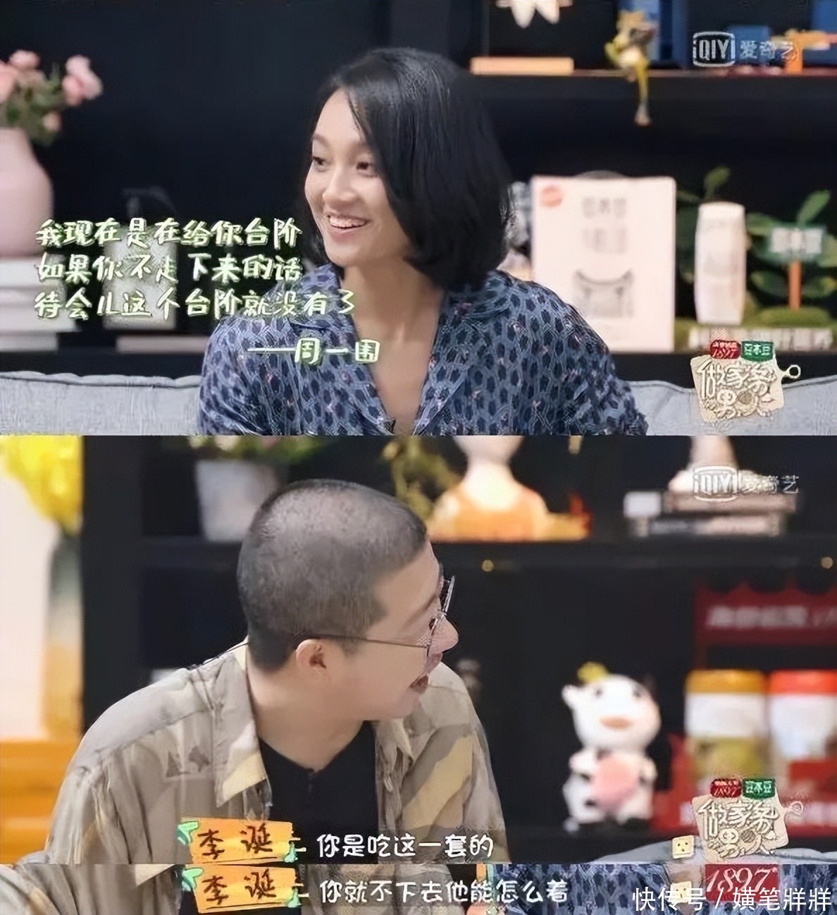 她曾在节目中提到,丈夫周一围雨天为她煮的一碗馄饨,被她视为无比珍稀的恩赐,脸上尽是谢意与珍摄,连李诞都忍不住簸弄。她还共享过夫妇争吵后,周一围那句“我目前是给你台阶下,你不下,待会儿这个台阶就没了”,并将其解读为丈夫上流的爱意。