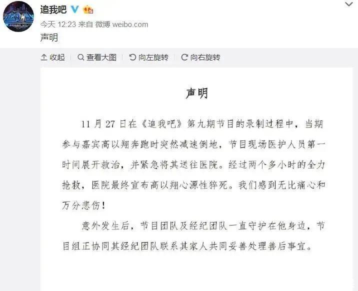 2019年,台湾艺东谈主高以翔在插足《追我吧》节目时,就因抢救无效而一火。
